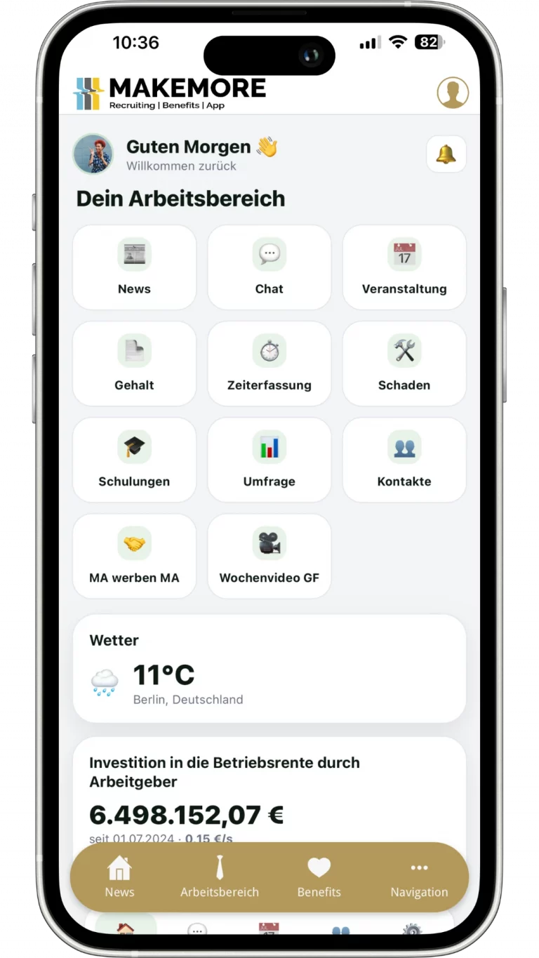 Die MAKEMORE-App bündelt alle wichtigen Funktionen, die HR-Prozesse vereinfachen, Mitarbeitendenbindung stärken und interne Kommunikation effizient gestalten – alles zentral in einer einzigen App.