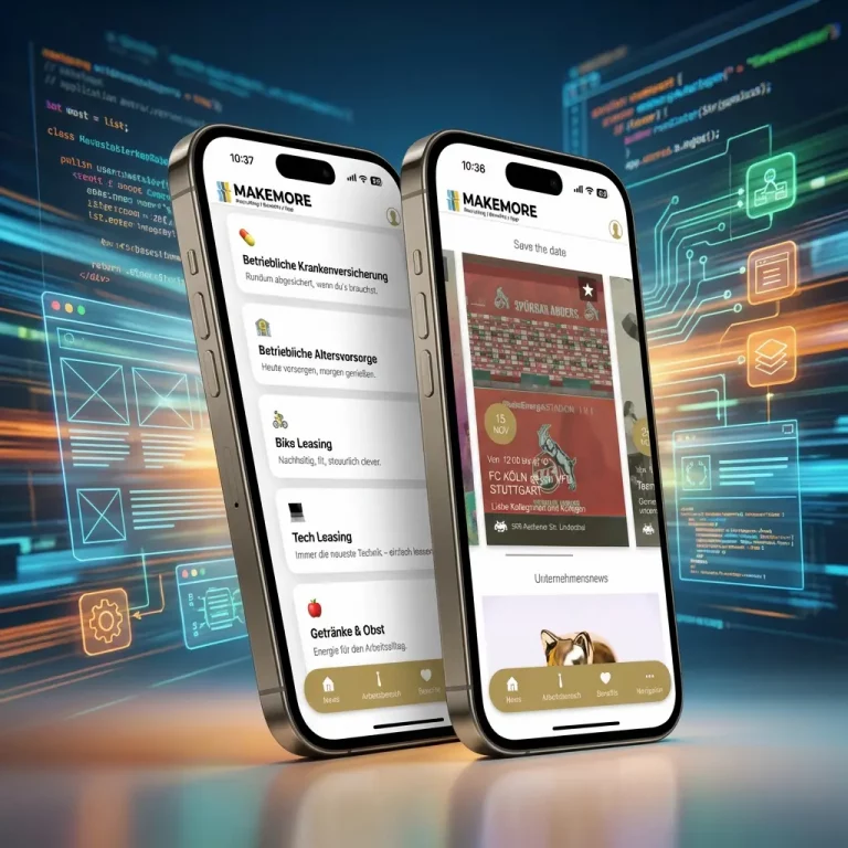 Die MAKEMORE-App bündelt alle wichtigen Funktionen einer modernen Mitarbeitenden-App: digitale Benefits und interne Kommunikation – alles übersichtlich, effizient und mobil nutzbar